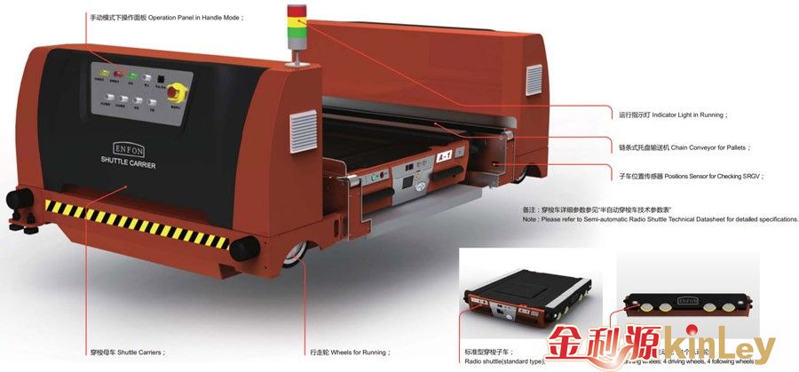 工作原理:行走电机通过驱动轴带动车轮,使穿梭车在轨道上做水平行走;输送电机通过正反向运行完成货物输送。